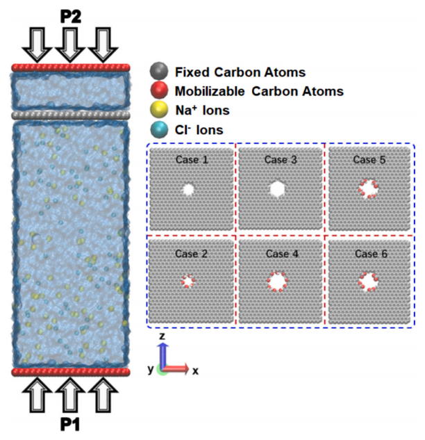 總結(jié):圖1通過初始模型示意圖和六種不同納米孔的展示,為研究水分子在納米孔中的傳輸行為提供了一個(gè)清晰的框架和具體的研究對象,有助于進(jìn)一步探索納米尺度下的水分子傳輸機(jī)制。