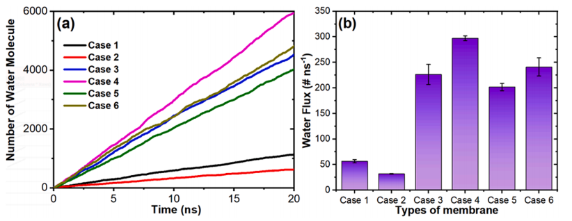 圖 2. (a) Case 1–Case 6 中水分子滲透率隨時(shí)間的變化;(b) 六種 GO 膜的水通量。