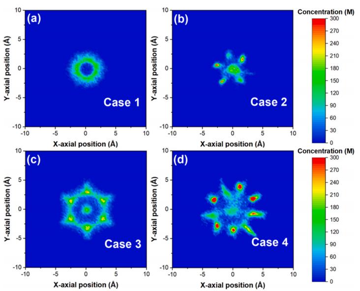 圖4. 水分子沿X-Y方向的二維濃度分布對比,(a) Case 1: GO-CH(小孔徑) (b) Case 2: GO-COH(小孔徑) (c) Case 3: GO-CH(大孔徑) (d) Case 4: GO-COH(大孔徑)。