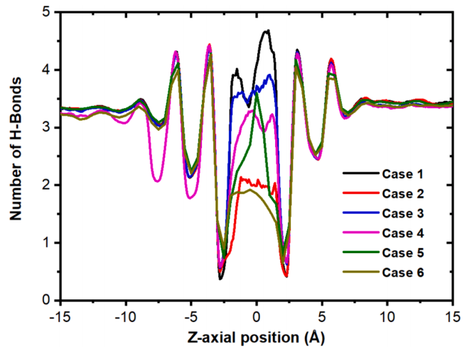 (b) Case 2: GO-COH(小孔徑):與Case 1不同,在小孔徑的親水性GO-COH納米孔中,水分子在進(jìn)入納米孔后會被羥基(COH)基團(tuán)明確吸附,并在所有羥基基團(tuán)附近形成濃度峰,與水分子形成氫鍵。這顯示了親水性基團(tuán)對水分子有更強(qiáng)的吸引力,導(dǎo)致孔內(nèi)水分子濃度較高。