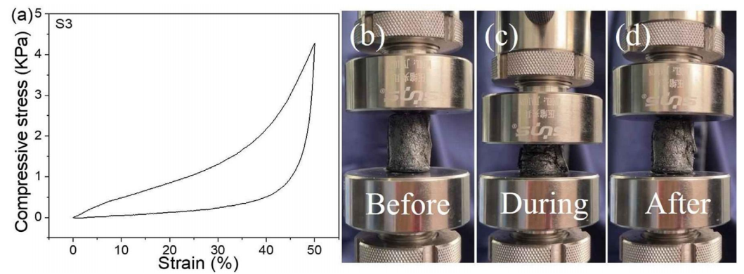 圖10. S3樣品的應力-應變曲線(a);壓縮測試前(b)、測試中(c)、測試后(d)的典型數(shù)碼照片
