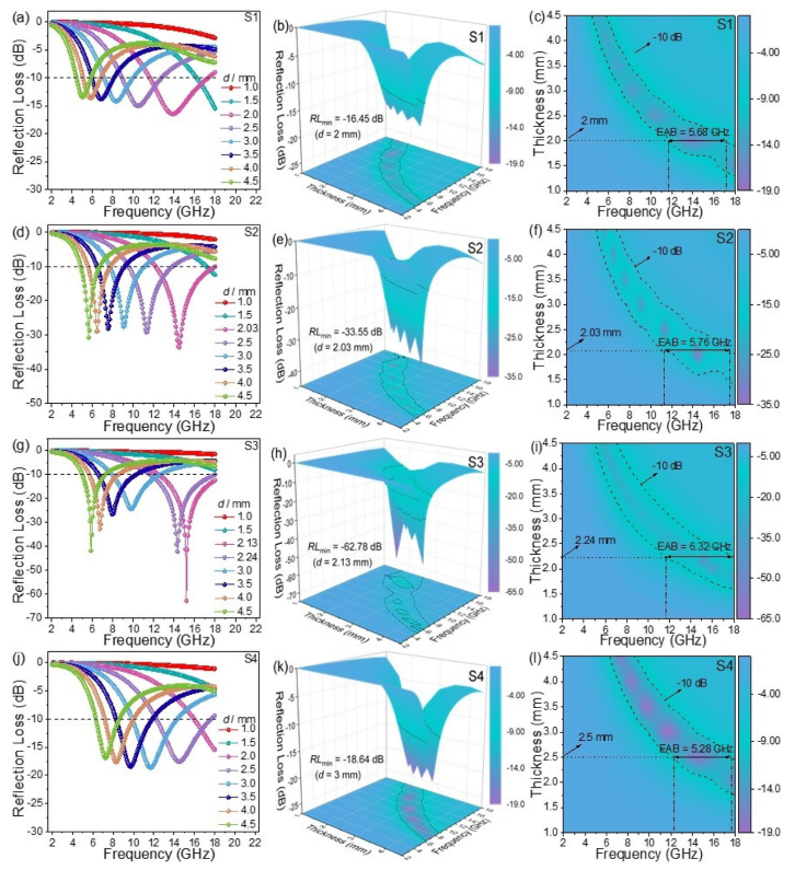 圖5. 反射損耗的頻率依賴性、反射損耗三維圖譜及二維等高線圖:(a-c)S1樣品,(d-f)S2樣品,(g-i)S3樣品,(j-l)S4樣品
