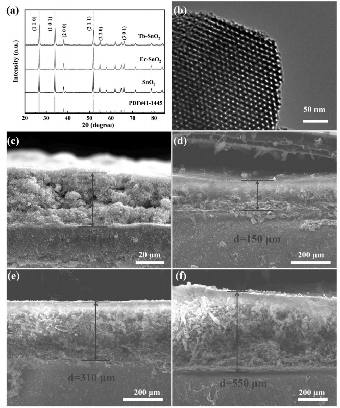 圖 3. (a) 裸SnO?納米纖維及稀土摻雜(RE-doped)SnO?納米纖維的XRD圖譜;(b) SBA-15顆粒的TEM圖像;(c-f) 測(cè)試瓷管上RE-SnO?涂層與RE-SnO?/SBA-15涂層的截面SEM圖像對(duì)比。