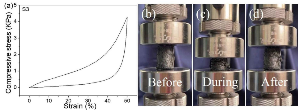 圖 10. S3 的應(yīng)力-應(yīng)變曲線 (a);S3 在壓縮測(cè)試前 (b)、中 (c) 和 后 (d) 的典型數(shù)碼照片。
