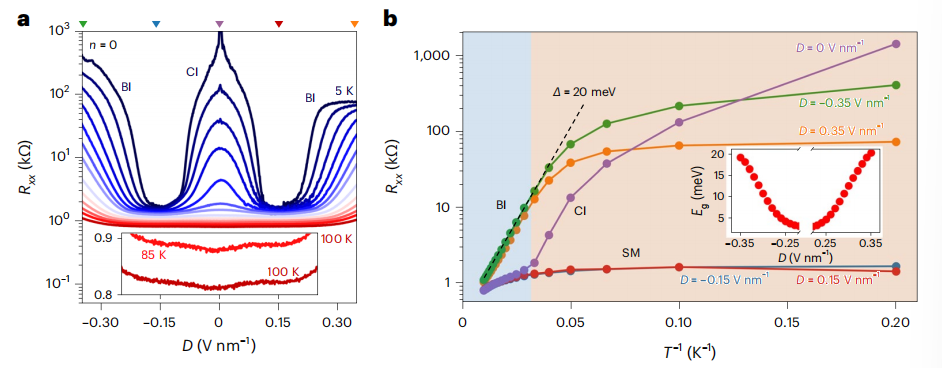 選取圖a中彩色三角標(biāo)記的五個(gè)位移場(chǎng),繪制5–100 K溫區(qū)的Rxx-T曲線。分為三類(lèi)物態(tài):關(guān)聯(lián)絕緣體(CI)、能帶絕緣體(BI)和半金屬(SM)。高溫區(qū)(T>40 K,藍(lán)色背景)CI態(tài)電阻行為與SM態(tài)相似;低溫區(qū)(橙色背景)CI態(tài)電阻急劇上升,表明能隙打開(kāi)。插圖:通過(guò)熱激活模型擬合提取的能帶絕緣體隙。