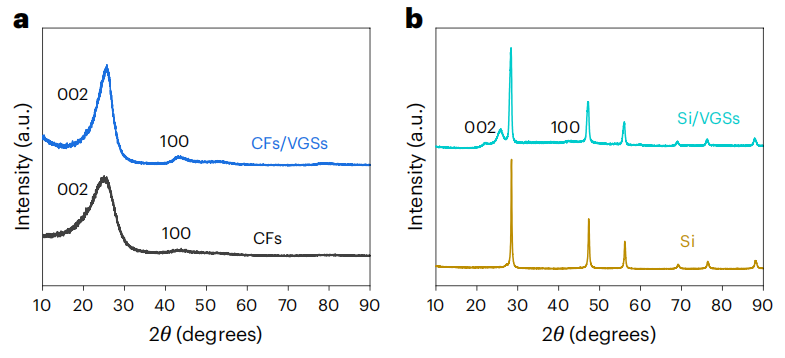 XRD驗證長程有序性,拉曼解析短程鍵合狀態(tài),共同證實VGSs在異質(zhì)基底(微米碳纖維/納米硅顆粒)上均實現(xiàn)晶體質(zhì)量可控的少層石墨烯生長。
