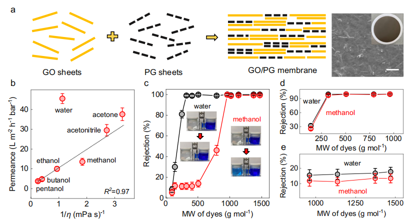 c. 水/甲醇混合溶劑中GO/PG膜的篩分性能