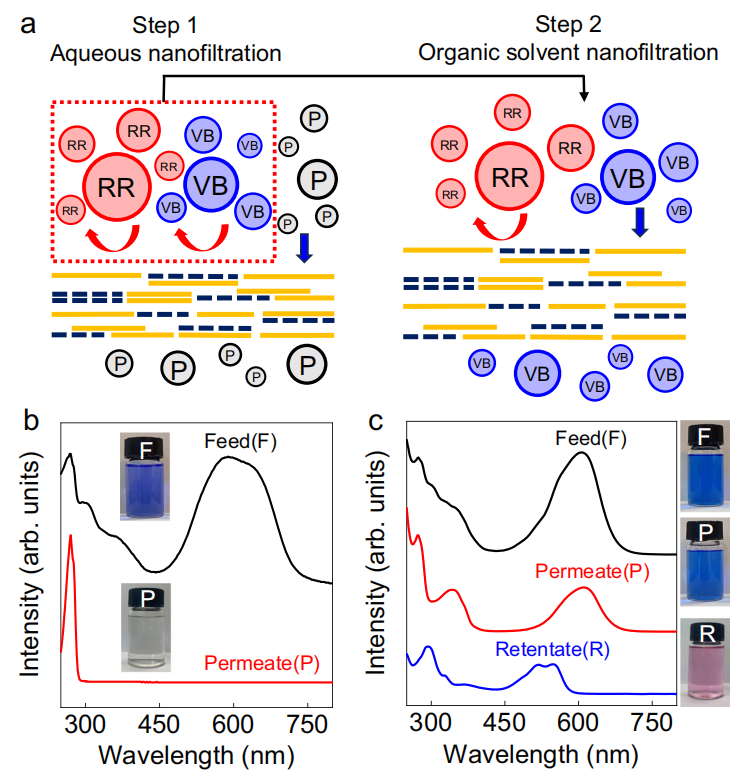 水相(層間距0.9 nm):酚(MW=94)優(yōu)先透過,VB(MW=478)和RR195(MW=1017)被截留。