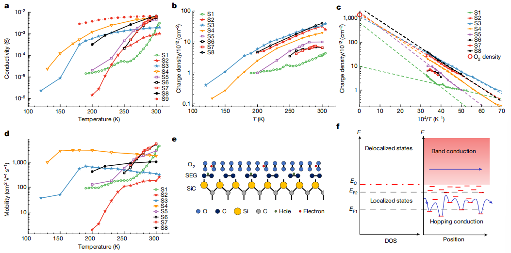 · 雙輸運(yùn)模式:低溫局域態(tài)跳躍(低遷移率)與高溫能帶輸運(yùn)(高遷移率)的轉(zhuǎn)變(圖f)。