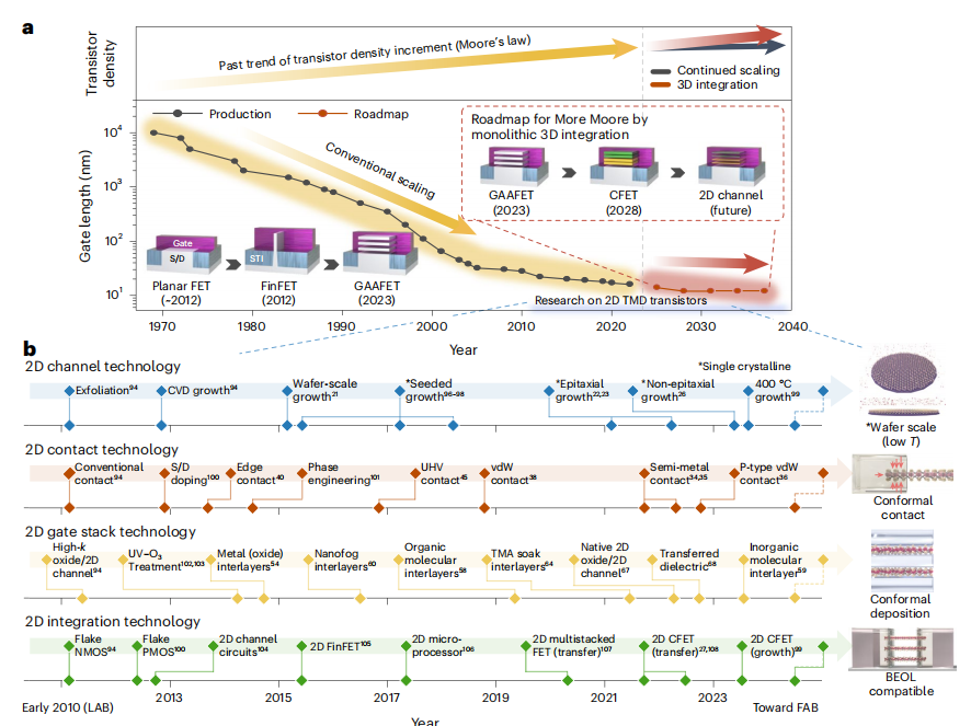 · *具體技術(shù)進(jìn)展 (b): 在實(shí)現(xiàn)未來(lái)技術(shù)(特別是基于2D TMD材料的三維器件)的道路上,過(guò)去十年在材料生長(zhǎng)、工藝處理等方面取得了顯著的技術(shù)突破,正處于從實(shí)驗(yàn)室研究 (LAB) 向商業(yè)化制造 (FAB) 推進(jìn)的關(guān)鍵階段。