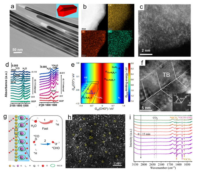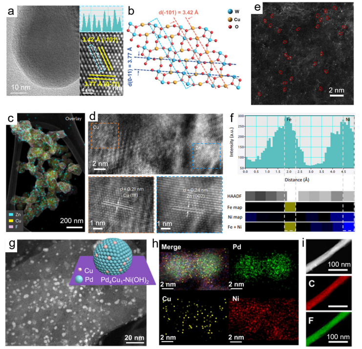 圖3 (a) Co-PPOLs的透射電子顯微鏡(TEM)圖像;(b) Co-PPOLs的球差校正高角環(huán)形暗場掃描透射電子顯微鏡(HAADF-STEM)圖像;(c) Co-PPOLs上電化學(xué)CO?轉(zhuǎn)化為CO的機(jī)理示意圖。經(jīng)Ref. 52授權(quán)轉(zhuǎn)載,版權(quán)屬于Wiley-VCH出版社(2023年)。(d) 含0.10 wt% Cu的Pd??Te?納米線TEM圖像(內(nèi)插圖比例尺:10 nm);(e) 圖3(d)內(nèi)插圖對應(yīng)的高分辨TEM(HR-TEM)及球差校正HR-TEM圖像;(f) HAADF-STEM圖像(上圖)及基于STEM-能譜(EDS)的線性分布分析(下圖)。經(jīng)Ref. 17授權(quán)轉(zhuǎn)載,版權(quán)屬于Springer Nature出版社(2019年)。(g) Zn?Mn?-SNC催化劑的球差校正STEM圖像,黃色橢圓標(biāo)示Zn-Mn雙金屬位點(diǎn);(h) 圖3(g)中Zn-Mn雙位點(diǎn)的二維原子分辨率圖譜;(i) 圖3(h)中Zn-Mn雙位點(diǎn)的三維原子分辨率圖譜(上圖)以及圖3(g)藍(lán)色橢圓區(qū)域1的強(qiáng)度分布曲線(下圖)。經(jīng)Ref. 57授權(quán)轉(zhuǎn)載,版權(quán)屬于Wiley-VCH出版社(2023年)。