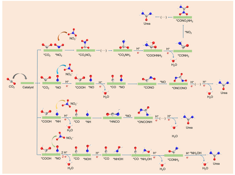② 右側(cè)路徑:創(chuàng)新性CO?/氮源共還原實(shí)現(xiàn)C-N鍵耦合,生成尿素、胺類等高附加值產(chǎn)物