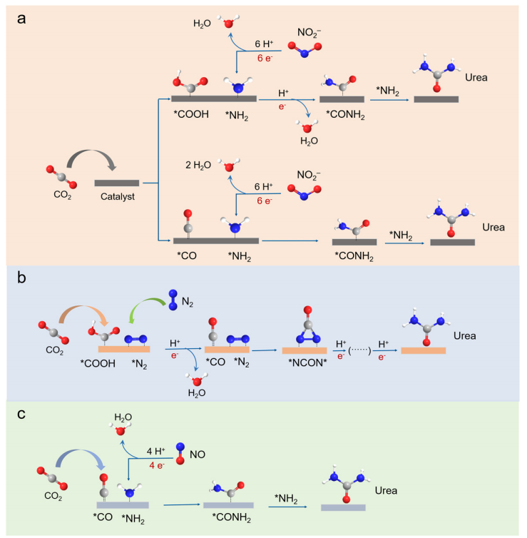 圖18 CO?與不同氮源(a)NO??、(b)N? 或(c)NO 電化學(xué)共還原合成尿素的生成機(jī)制圖解(參考文獻(xiàn)258, 269, 290, 313)