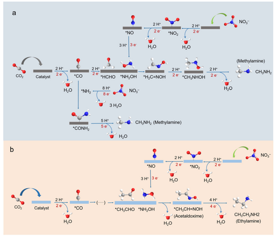為提升產(chǎn)物附加值并拓展多樣性,在電催化CO?還原體系中引入氮源(如NO??、NO??、N?或NO)可實(shí)現(xiàn)C-N偶聯(lián),合成尿素、甲胺、乙胺等高值含氮有機(jī)物。然而當(dāng)前CO?電還原仍面臨產(chǎn)物收率低、法拉第效率不足及反應(yīng)機(jī)制不明確等挑戰(zhàn)。因此,亟需系統(tǒng)綜述電催化劑設(shè)計(jì)與耦合反應(yīng)體系構(gòu)建策略,以實(shí)現(xiàn)CO?還原產(chǎn)物的增值化與多元化。