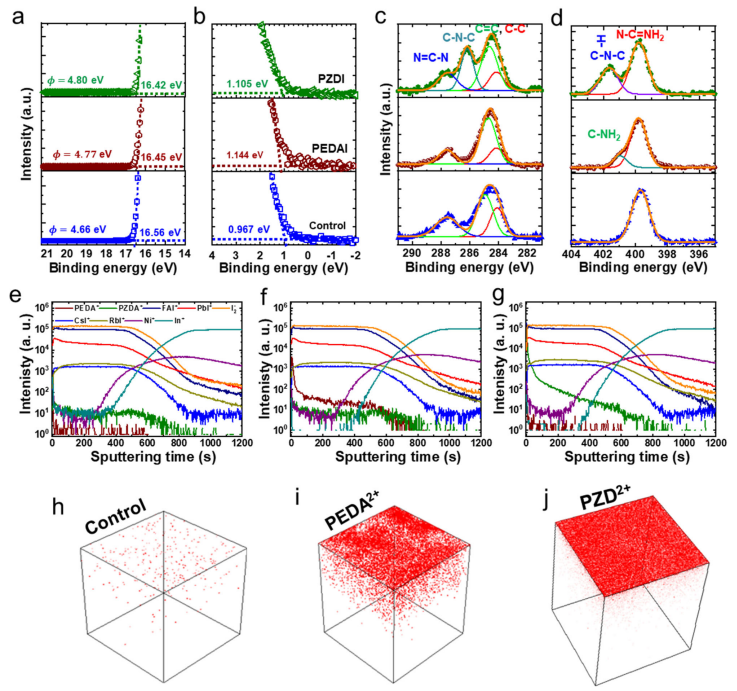 展示未經(jīng)鈍化(Control)、PEDAI和PZDI處理的鈣鈦礦薄膜的紫外光電子能譜(UPS),用于分析功函數(shù)(?)和價(jià)帶頂(Ei)能量變化,揭示表面能級(jí)調(diào)控機(jī)制。