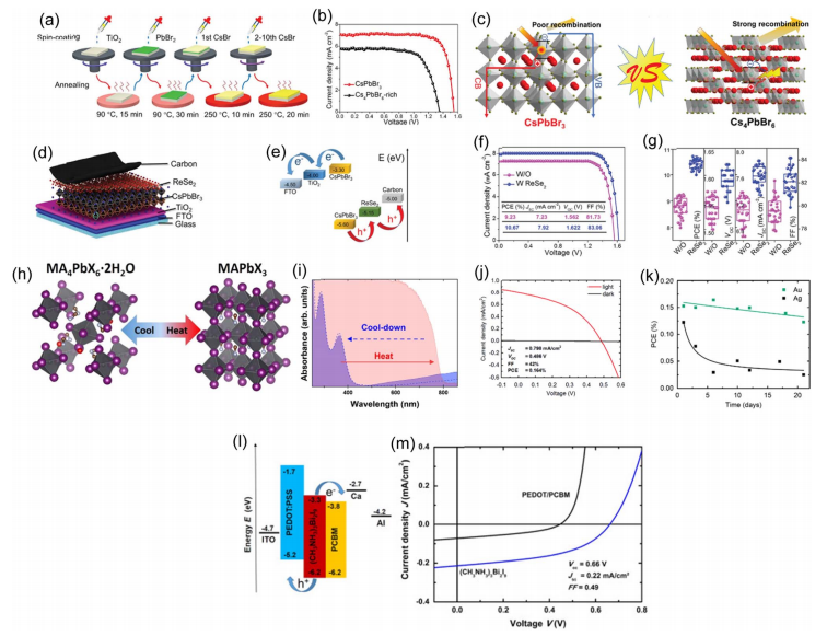 圖2 (a) 多步生產(chǎn)方法的示意圖。(b) 具有和不具有Cs4PbBr6的CsPbBr3基鈣鈦礦太陽能電池(PSCs)的J-V特性。(c) Cs4PbBr6誘導(dǎo)載流子復(fù)合的過程。(d) 具有ReSe2定制結(jié)構(gòu)的全無機(jī)CsPbBr3 PSC。(e) 全無機(jī)、ReSe2定制的CsPbBr3 PSC的能級(jí)圖。(f) J-V曲線。(g) 不同PSCs在有無ReSe2情況下的光伏性能統(tǒng)計(jì)。(a)-(g) 已獲許可復(fù)制,版權(quán)2022,Wiley。(h) 左上角是MA4PbI6·2H2O的晶體結(jié)構(gòu),右上角是MAPbI3的晶體結(jié)構(gòu)。(i) 圖像展示了純甲基銨碘化鉛樣品(藍(lán)色)、在100°C下熱退火后(紅色)以及冷卻至室溫后(藍(lán)色虛線)的光學(xué)吸收情況。(h)和(i) 已獲許可復(fù)制,版權(quán)2021,ACS。(j) J-V特性。(k) 具有Ag和Au頂接觸的MABI器件的穩(wěn)定性隨功率轉(zhuǎn)換效率(PCE)隨時(shí)間的變化。(j)和(k) 已獲許可復(fù)制,版權(quán)2017,RSC。(l) 能級(jí)圖中的數(shù)字是相對(duì)于真空給出的。(m) 在光照下,具有(CH3NH3)3Bi2I9吸收體(藍(lán)色)和無吸收體的參考電池(黑色)的J-V曲線。(l)和(m) 已獲許可復(fù)制,版權(quán)2016,Elsevier。