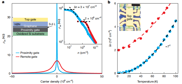 2、接近門控:在石墨烯附近放置石墨門,通過靜電屏蔽(proximity screening)顯著提高了石墨烯的電子質(zhì)量。