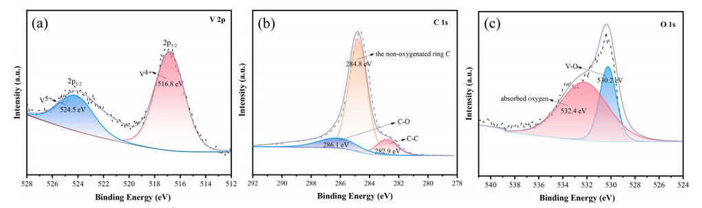 圖3 C@NVO-400樣品的高分辨率X射線光電子能譜(XPS):(a) V 2p譜,(b) C 1s譜,(c) O 1s譜。