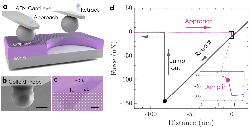 石墨烯-硅襯底體系中的薄膜厚度可以精確控制至原子尺度,為解決這一爭(zhēng)議問題提供了理想實(shí)驗(yàn)平臺(tái)。然而,在單原子層厚度下,薄膜極易發(fā)生幾何非線性變形,對(duì)實(shí)驗(yàn)測(cè)量和數(shù)據(jù)解析帶來巨大挑戰(zhàn)。針對(duì)這一難題,團(tuán)隊(duì)提出了“原子力顯微鏡表征+非線性薄膜力學(xué)分析”相結(jié)合的研究方案。研究人員首先通過配備膠體探針的原子力顯微鏡(圖1),測(cè)量了石墨烯在懸浮與支撐狀態(tài)下的拉脫力(pull-off force)。結(jié)果表明,拉脫力可通過接觸力學(xué)模型轉(zhuǎn)化為界面能,其轉(zhuǎn)換系數(shù)隨薄膜可變形能力增強(qiáng)而漸近收斂至剛性結(jié)構(gòu)的一半(圖2)。這一修正對(duì)于解釋薄膜材料自發(fā)撕裂等界面現(xiàn)象至關(guān)重要。