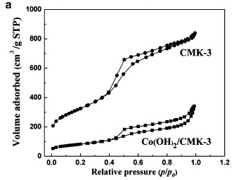 另外,本材料具有有序中孔孔道結構,孔徑尺寸3.9 nm,比表面積在500-1500 m2/g范圍之內(nèi)??兹菰?.7-1.5 cc/g之間。中孔炭材料具有較高的比表面積和孔容以及良好的導電性、生物相容性和耐腐蝕性等特點,在電化學電極材料、催化劑載體、色譜柱吸附劑、蛋白質(zhì)分離等領域有巨大應用前景。
