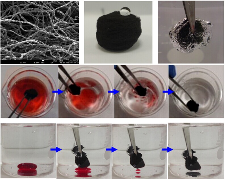 東南大學(xué)孫立濤課題組,以棉花或廢紙為原料,成功制備出碳纖維海綿。該海綿具有超強(qiáng)憎水性和親油性。這種碳纖維海綿可以快速有效的將水上或水下的油類(lèi)或有機(jī)污染物清除掉。同時(shí),基于其優(yōu)異的熱穩(wěn)定性和化學(xué)穩(wěn)定性,可以采用加熱、擠壓或燃燒的方法,對(duì)其進(jìn)行回收再用。該海綿具有非常高的吸附率,1g海綿可以吸附190g污染物,遠(yuǎn)遠(yuǎn)高于傳統(tǒng)的吸附材料如吸油枕(1g吸附10g左右污染物)。將這些海綿裝入編織袋中,變成了碳基吸油枕。使用起來(lái)非常方便,同時(shí)還具有非常高的吸附效率。